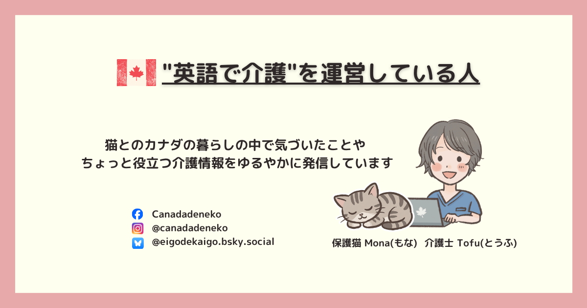 はじめまして。カナダで愛猫 Mona (もな) と暮らしている Tofu (とうふ) です。日々の暮らしの中で感じたことや、猫との生活で気づいたこと、そしてちょっと役立つ介護情報を発信しています。猫は何も言わないけれど、大切なことに気づかせてくれる存在。そんな日常を、ゆるやかにシェアしています。
