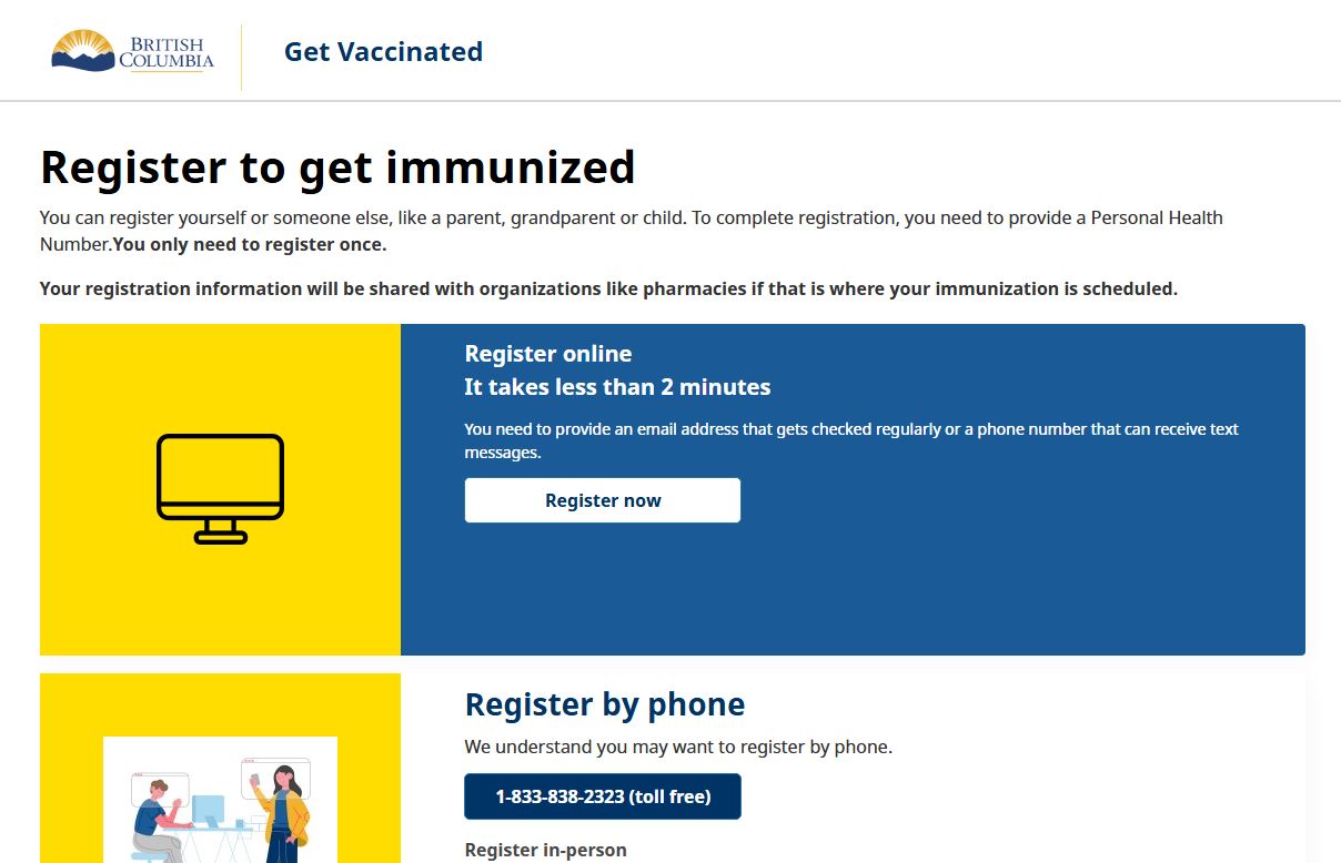 BC州の予防接種予約は、「Get Vaccinated」システムによって一元管理されています。登録を済ませておくと、接種時期が来た際に自動的に通知が届き、自宅近くのクリニックや薬局から簡単に予約を入れることができます。